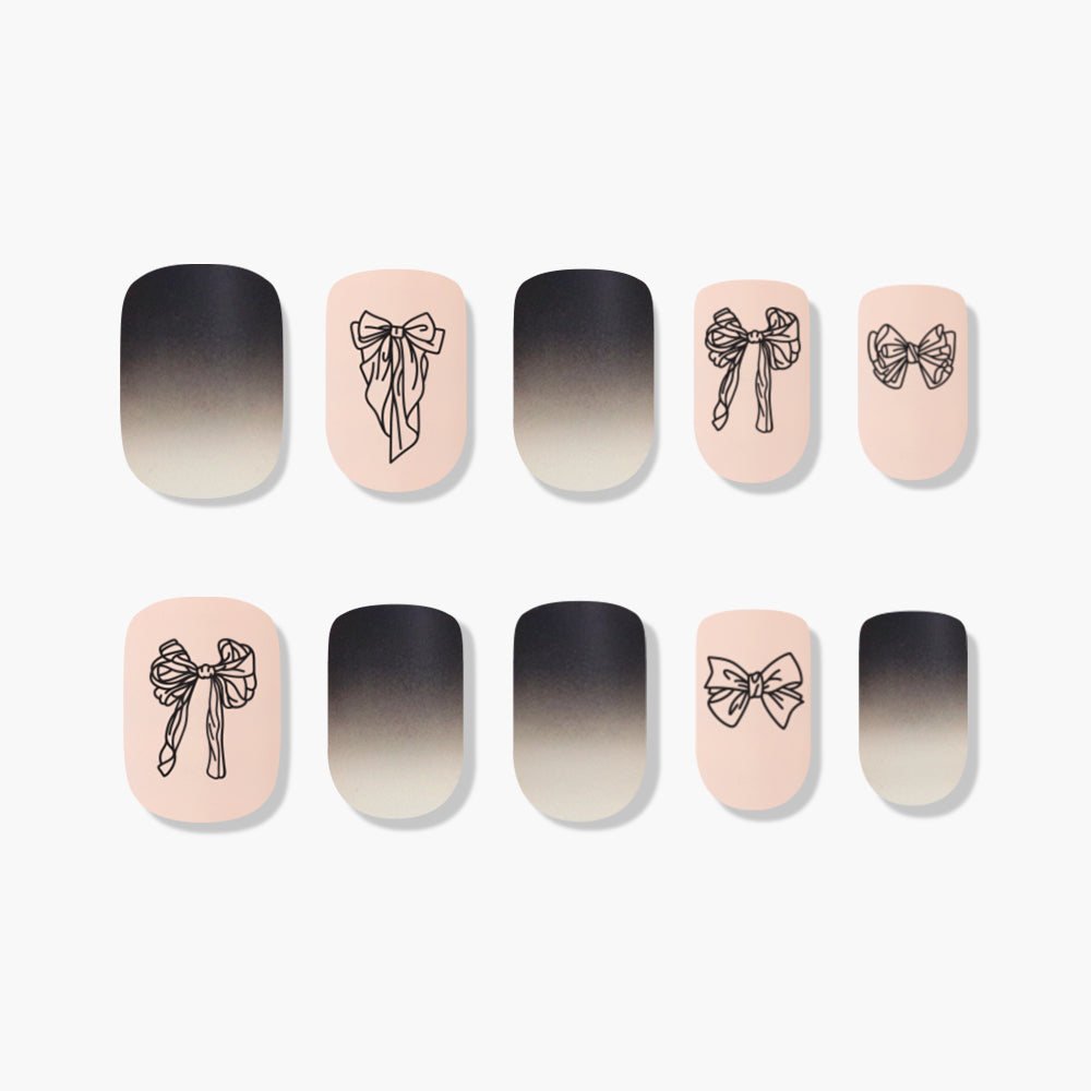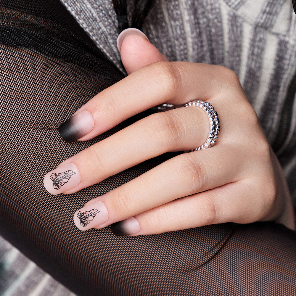 If you’re looking to try something different, choose the lovely funky nail “Vintage.” A matte black gradient paired with ribbon drawings maximizes its funky vibe, creating versatile moods depending on how you style it.
