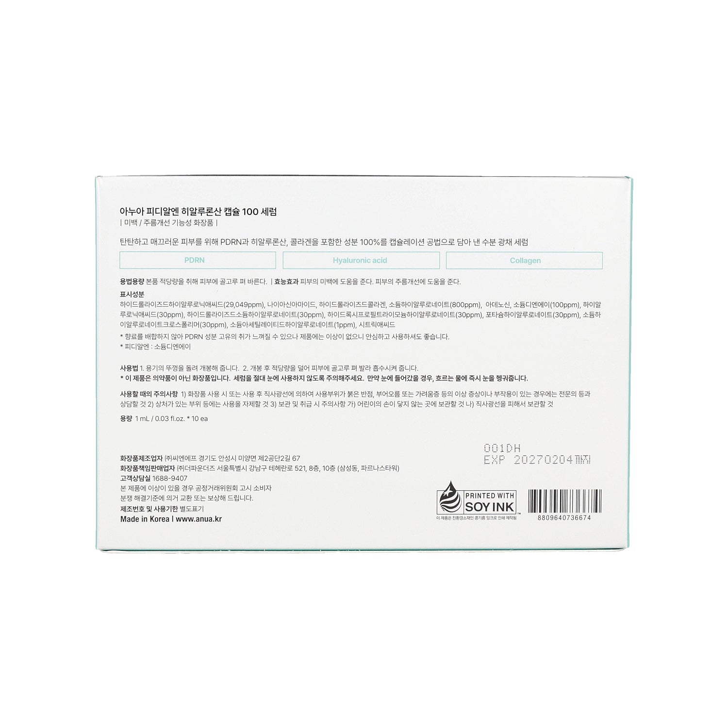 • Purified Water, Butylene Glycol, Propanediol, Glycerin, Hydrolyzed Hyaluronic Acid, 1,2-Hexanediol, Niacinamide, Glyceryl Oleate, Lauryl Glucoside, Myristyl Glucoside, Polyglyceryl-6 Laurate, Hydrogenated Lecithin, Glutathione, Hydrolyzed Collagen, Sodium Hyaluronate, Coptis Root Extract, Adenosine, Sodium DNA, Hyaluronic Acid, Hydrolyzed Sodium Hyaluronate, Hydroxypropyltrimonium Hyaluronate, Potassium Hyaluronate, Sodium Hyaluronate Crosspolymer, Sodium Acetylated Hyaluronate, Neem Leaf and Flower Extract, Ivy Gourd Fruit Extract, Eggplant Fruit Extract, Holy Basil Leaf Extract, Citric Acid, Turmeric Root Extract, Coral Extract, Sodium Citrate, Pentylene Glycol.