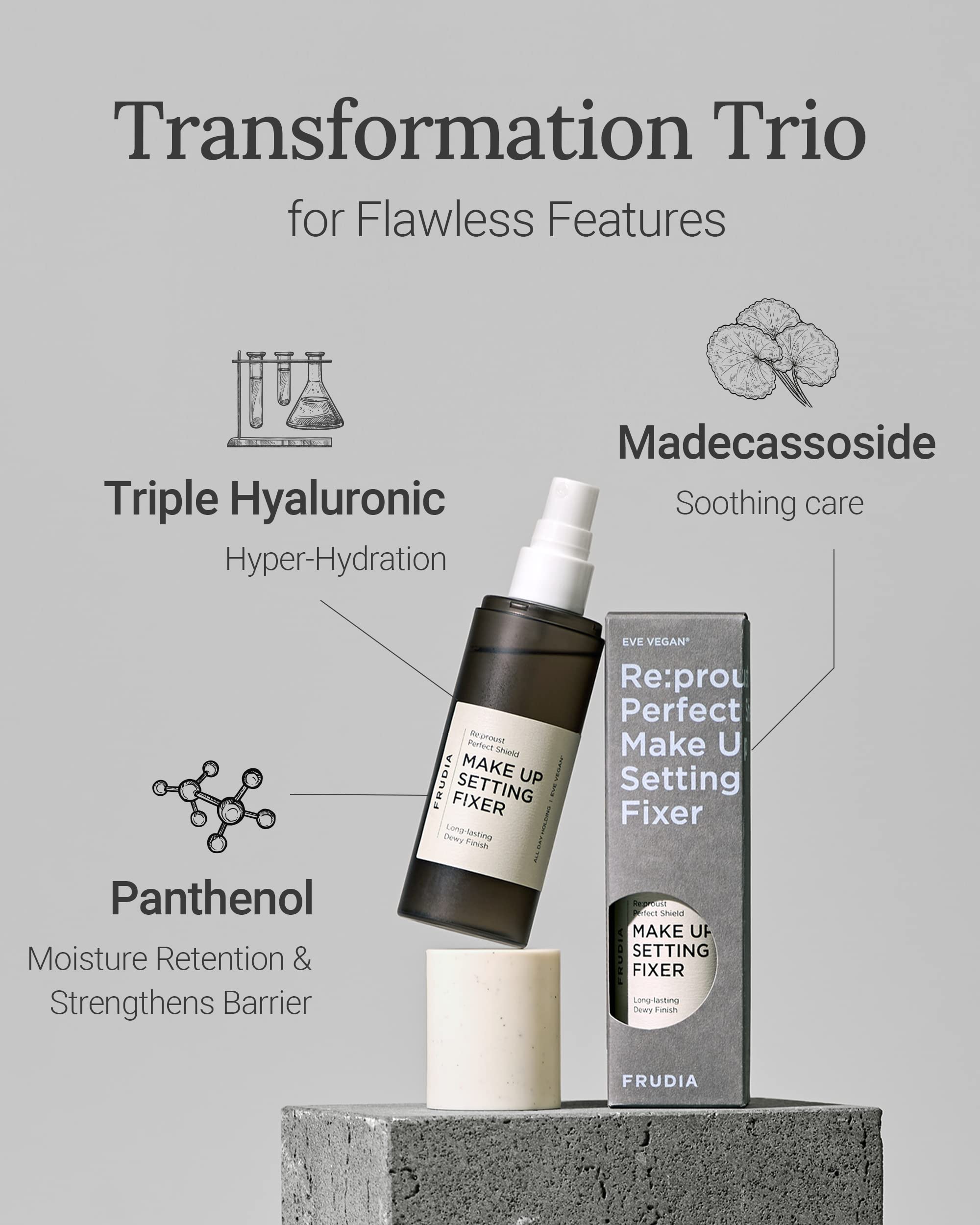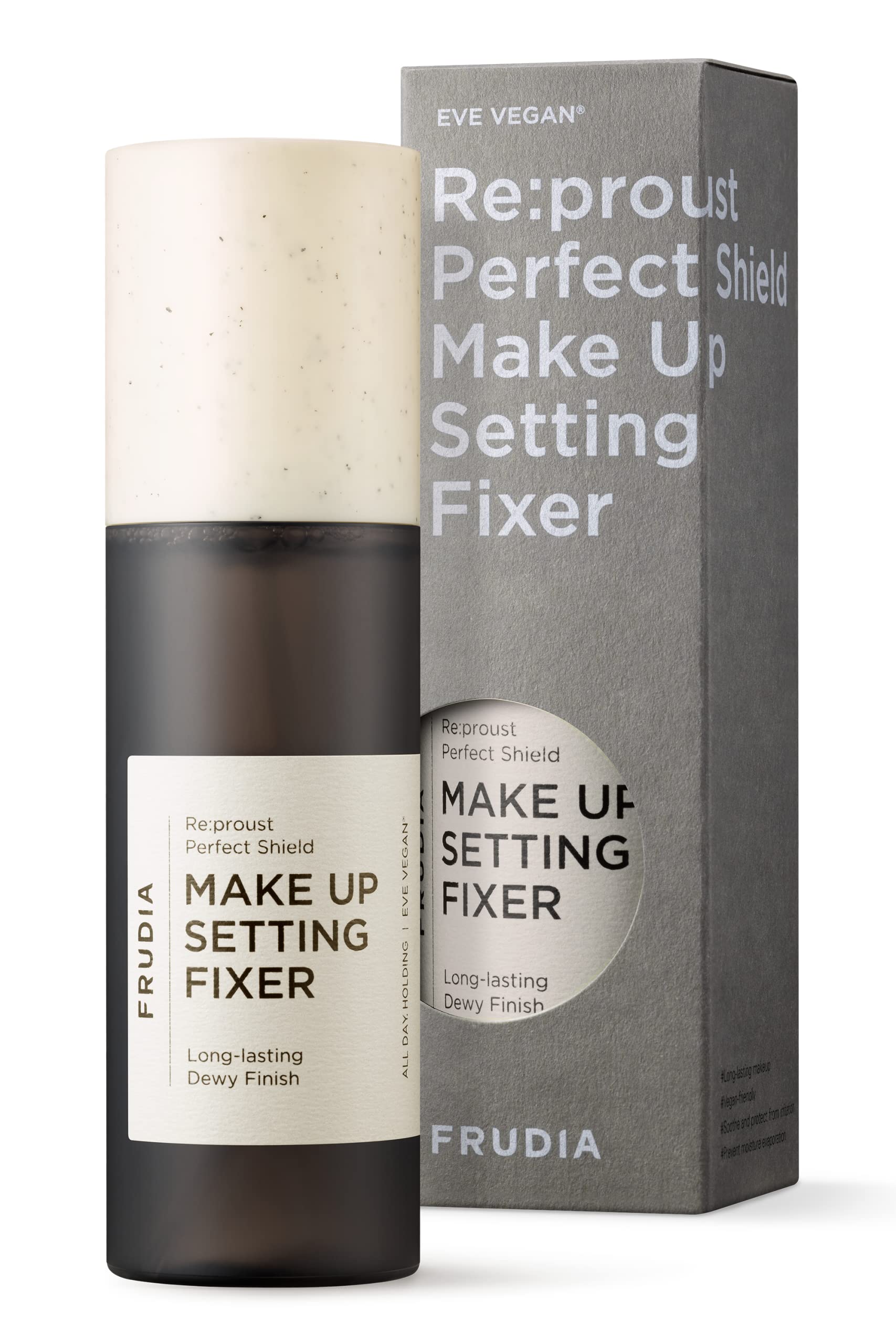 FRUDIA Re:proust Perfect Shield Makeup Setting Fixer 120ml is a vegan makeup setting spray, that allows your morning makeup to last until the evening without collapsing due to sebum.